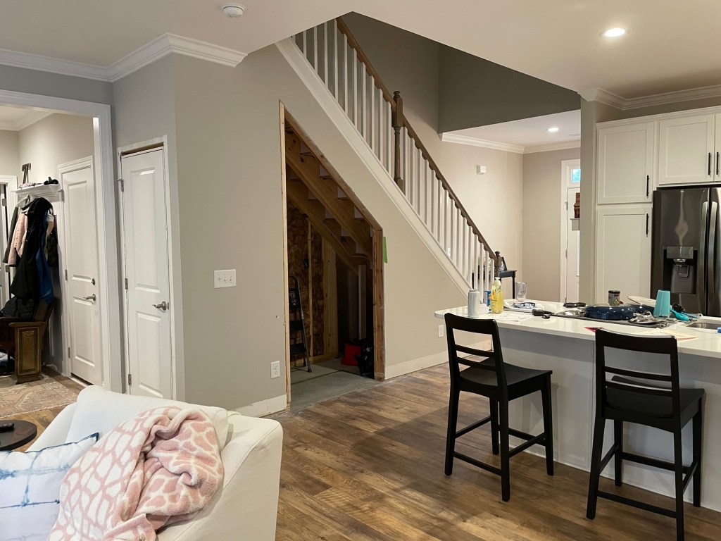 I live near Bogue Sound, in a builder-grade home that I’ve been slowly making my own on a budget. Storage space has been an issue from day 1. So I decided to knock down the wall under my stairs and to turn it into a pantry meets coffee bar setup, with a mix of function, style, but on a budget.